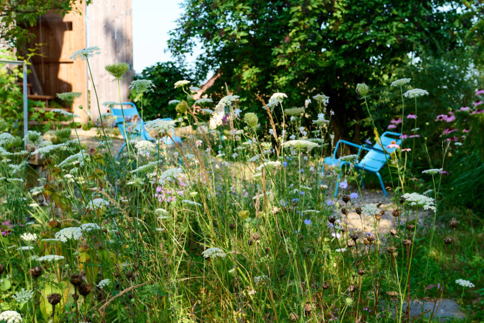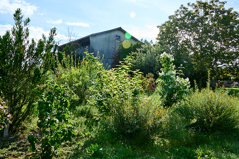 Eine alte umgenutzte Scheune mit schwieriger Garten-situation dient als eigene Experimentier- und Erholungszone. Immer mehr einheimische Wildstauden und Sträucher bereichern den Garten und steigern zudem die Attraktivität für eine Vielfalt an Tieren.