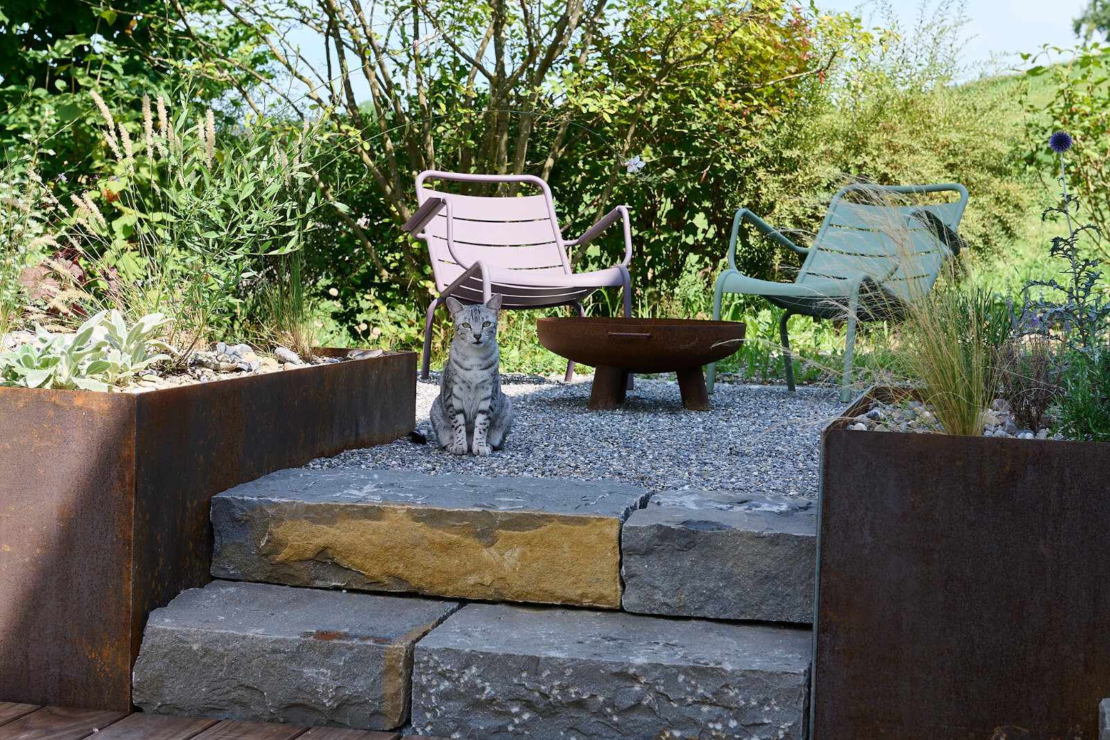 Stilvolle und moderne Interpretation eines ‘Senkgartens’. Neugestaltung Sitzplatz.