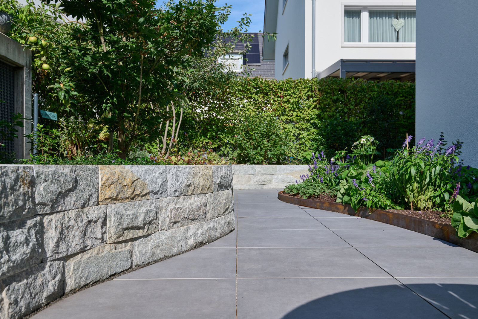 Einbindung neuer Staudenbeete mit ganzjähriger Attraktivität, Insekten- und Vogelnahrung, Wildwiesenabschnitt, Naturhecke und neuer Obstbaum Pflanzung. Verwendung lokaler Materialien und offene, sickerfähige Bodenbeläge.