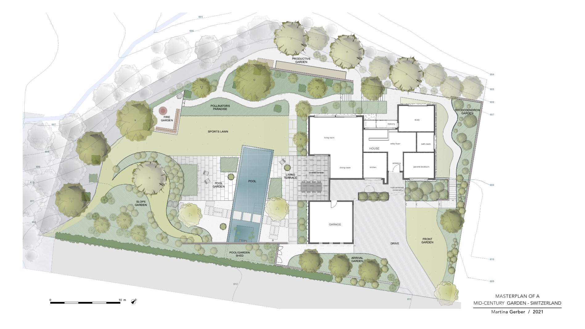 Umfassende Projektstudie für eine Neugestaltung und Auffrischung eines Mehrgenerationen Gartens mit bestehendem Einfamilienhaus, altem Aussenpool, Hanglage und Waldanstoss.